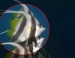 眼斑双锯鱼,背鳍硬棘被橘黄色斑块分割为5-6枚,第4枚最长,约为头长的2.1-2.9倍。胸鳍、臀鳍…