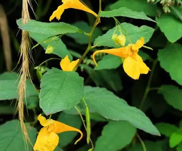 水金凤(学名:Impatiens noli-tangere Linn.):是凤仙花科,凤仙花属一年生草本植物,高可达70厘米。茎肉质,直立,叶互生;叶片卵形或卵状椭圆形,边缘有粗圆齿状齿,上面深绿色,下面灰绿色;叶柄纤细,总状花序;苞片草质,披针形,花黄色;侧生萼片卵形或宽卵形,旗瓣圆形或近圆形,翼瓣无柄,唇瓣宽漏斗状,花丝线形,花药卵球形,顶端尖;子房纺锤形,蒴果线状圆柱形,种子多数,7-9月开花。