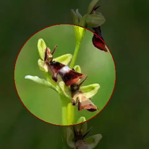 总花梗长1-1.5厘米,具2-4花,排列成总状花序;花梗长1.5-2毫米,中上部有1枚苞片;苞片草质,披针形,长3-5毫米,宿存;花黄色;侧生2萼片卵形或宽卵形,长5-6毫米,先端急尖;旗瓣圆形或近圆形,直径约10毫米,先端微凹,背面中肋具绿色鸡冠状突起,顶端具短喙尖;翼瓣无柄,长20-25毫米,2裂,下部裂片小,长圆形,上部裂片宽斧形,近基部散生橙红色斑点,外缘近基部具钝角状的小耳;唇瓣宽漏斗状,喉部散生橙红色斑点,基部渐狭成长10-15毫米内弯的距。雄蕊5,花丝线形,上部稍膨大,花药卵球形,顶端尖;子房纺锤形,直立,具短喙尖。
