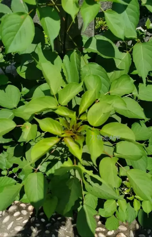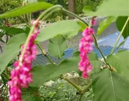 虎杖(学名:Reynoutria japonica Houtt.):蓼科,虎杖属多年生草本植物。根状茎粗壮,茎直立,高可达2米,空心,叶宽卵形或卵状椭圆形,近革质,两面无毛,顶端渐尖,基部宽楔形、截形或近圆形,托叶鞘膜质,圆锥花序,花单性,雌雄异株,腋生;苞片漏斗状,花被淡绿色,瘦果卵形,有光泽黑褐色,8-9月开花,9-10月结果。