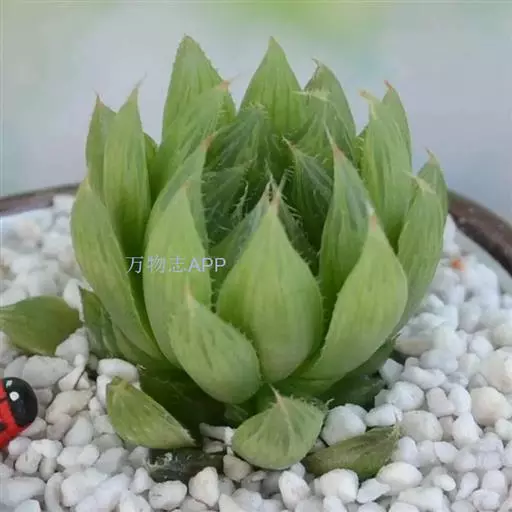 植株矮小,株高一般5~6厘米。叶片互生,长圆形或匙状,肉质肥厚,生于极短的茎上,紧密排列为莲座状,叶色翠绿色,叶肉呈半透明状,叶面有8~12条暗褐色条纹或中间有褐色、青色的斑块,叶缘粉红色,有细锯齿。顶生总状花序,花极小。是常见的多肉植物之一。
