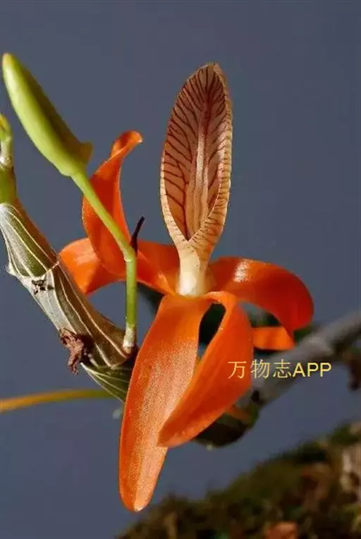 独角石斛,Dendrobium unicum,兰科石斛属植物。花瓣橙黄色,唇瓣反转似犀牛角,布有橘红色网纹。