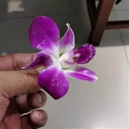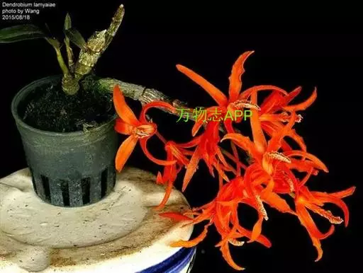 其唇瓣反转似犀牛角,布有深橙红色网纹,非常独特。这是个非常吸引人的小型种,目前已成为mini春石斛兰与非典型春石斛兰的重要亲本,虽然它没有饱满圆整的花型,但是花瓣橙红色与唇瓣上筋状网脉的遗传使得它异军突起,逐渐受到追捧。