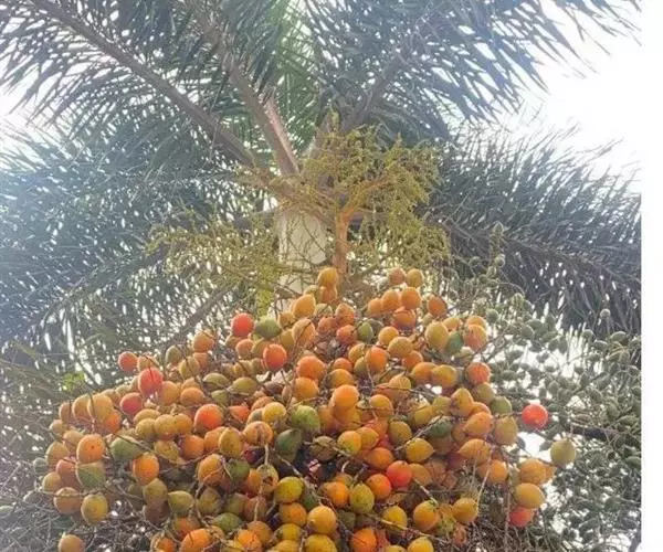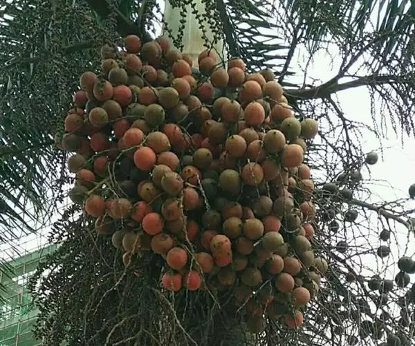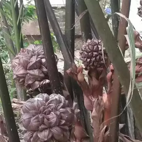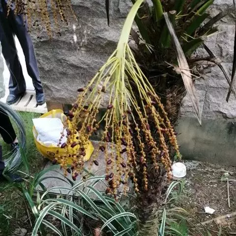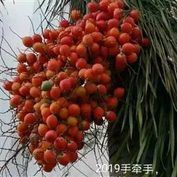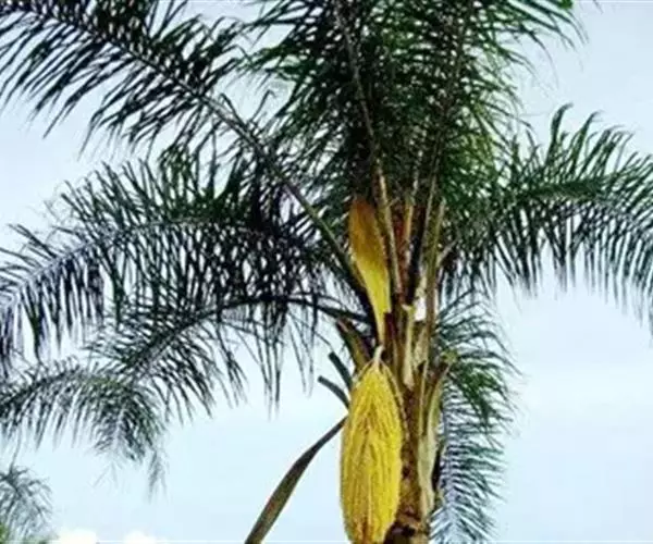 花序生于叶腋间,长达1米以上,一回分枝,分枝多达80个或更多,每分枝长30-50厘米,之字形弯曲,基部至中部着生雌花,顶部着生雄花;花序梗上的大苞片(大佛焰苞)舟状,木质化,长达150厘米,宽达14厘米,顶端呈长喙状,背面具纵沟槽;花雌雄同株;雄花长7-16毫米(顶部的较短);雌花长达4.5-6毫米,宽4-6毫米。果实近球形或倒卵球形,长3厘米,直径2.7厘米,稍具喙,外果皮光滑,新鲜时橙黄色,干后褐色,中果皮肉质具纤维,内果皮厚,骨质,坚硬,内果皮腔形状不规则,近基部有3个萌发孔。种子与内果皮腔同形,胚乳均匀具棱,中央有1个小的空腔,胚近基生。花期2月,果期11月至翌年3月。
