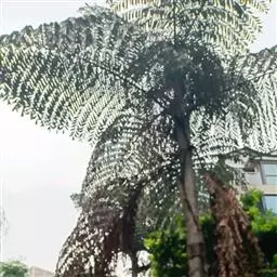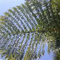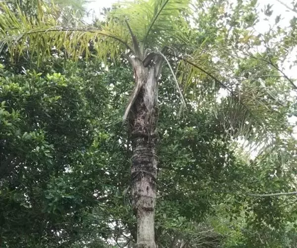乔木状,干高10-15米,直径20-40厘米。叶羽状全裂,长4-5米,羽片多,每2-5片靠近成组排列成几列,每组之间稍有间隔,线状披针形,最大的羽片长95-100厘米,宽约4厘米,顶端的稍疏离,较短,狭成线形(宽约2厘米),具1条明显的中脉,横脉细而密,两面及边缘无刺,背面中脉上被鳞秕,羽片先端浅2裂;叶柄及叶轴被易脱落的褐色鳞秕状绒毛。