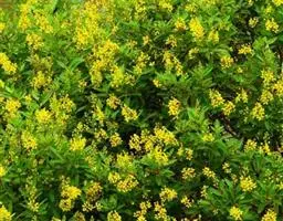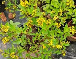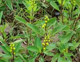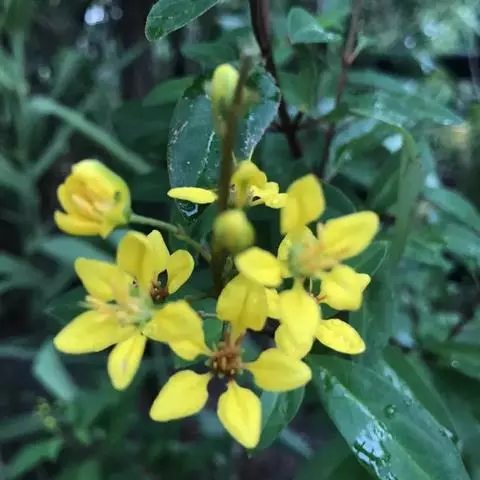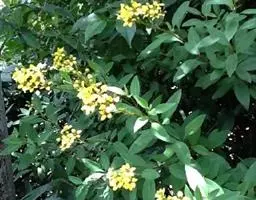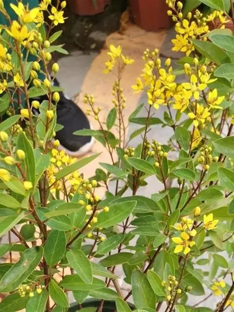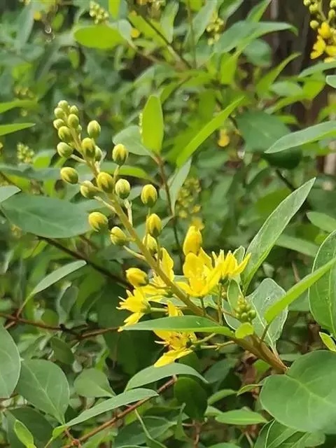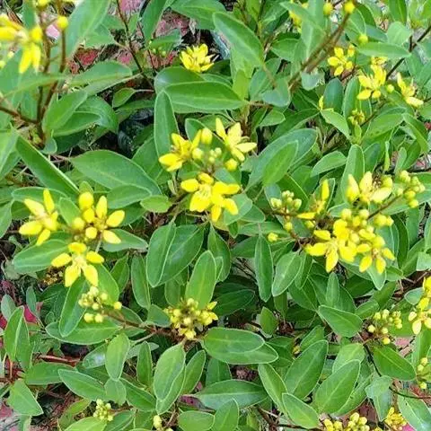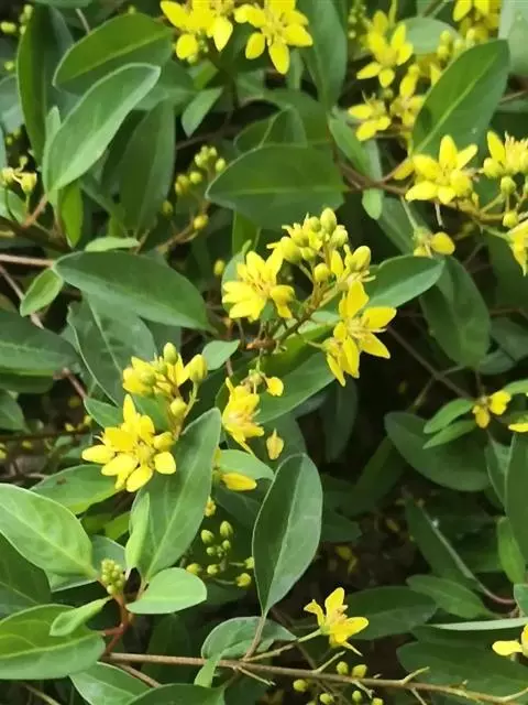 金英常绿灌木,株高约50-160厘米,嫩茎红色。叶片绿色,对生,椭圆形,先端尖,基部楔形,全缘。…