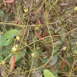 无根藤寄生缠绕草本植物,借盘状吸根攀附于寄主植物上。茎线形,稍木质,叶退化为微小的鳞片。…