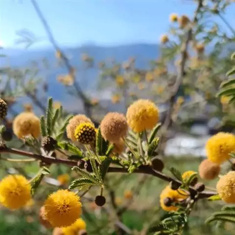 叶金合欢一种速生的小乔木,可长到6米高,树冠可伸展到3米宽,树型美观俊挺。冬季和早春盛开朵朵芬芳的金黄毛球状花。有趣的是她幼年的叶片和成熟后的叶片形态截然不同,前者似轻柔白羽毛,后者却呈椭圆形,为迷人的银绿色。无论植于山坡或是水边,其优雅自树姿都是一道亮丽的景观。 花语:稍纵即逝的快乐。