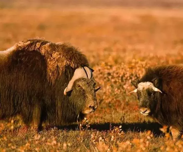 麝牛又叫麝香牛,在外形上很像牛,角也似牛,同时,四肢没有臭腺和雌兽有4个乳头等方面都与牛类相似,但它的尾特别短,耳朵很小,眼睛前面具有臭腺,四肢也非常短,吻边除了鼻孔间的一小部分外,都被毛所覆盖,这些又与牛类不同。牛的角是从头顶侧面长出,而麝牛和其他羊类一样,是从头顶上长出。它的臼齿与山羊类似。麝牛学名的意思就是“羊牛”,说明它是牛与羊之间的过渡类型动物。