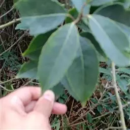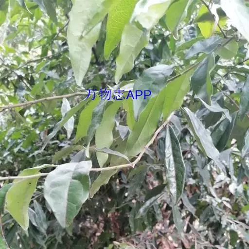 叶革质,椭圆形或阔椭圆形,稀矩圆形,长5-10厘米,宽1.8-5厘米,两端钝形或基部圆形,边缘微反卷或皱波状,上面幼时具银白色和少数褐色鳞片,成熟后脱落,具光泽,干燥后褐绿色或褐色,下面密被银白色和少数褐色鳞片,侧脉7-9对,与中脉开展成50-60度的角,近边缘分叉而互相连接,上面显著凸起,下面不甚明显,网状脉在上面明显,下面不清晰;叶柄深褐色,长5-8毫米。