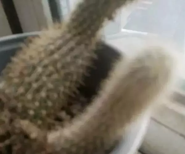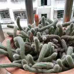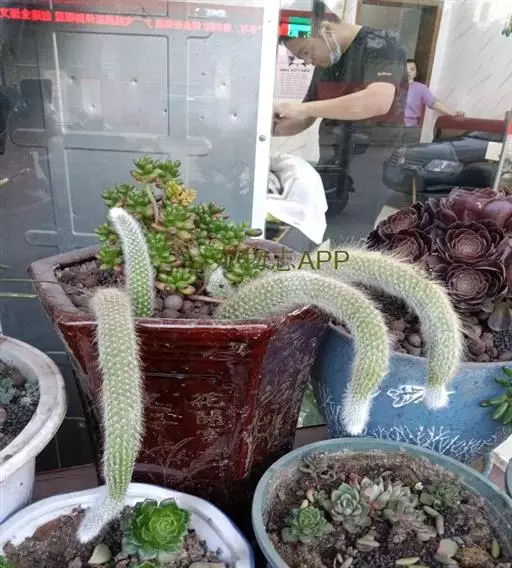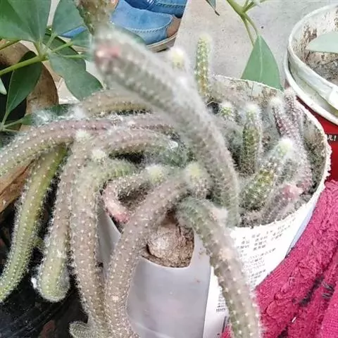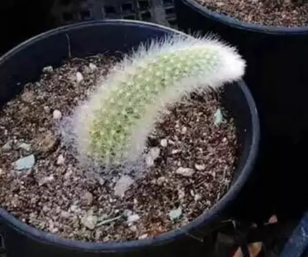 猴尾柱长长的尾巴 多年生的长柱状垂挂型肉质植物。刺软质,色白,如同厚厚的动物绒毛。外形与黄金纽酷似,但是黄金纽刺为黄色,且更短,更硬质。花为玫红色,花瓣边缘泛白色,且易开花,栽培得当整个夏天可以持续开花,花形与仙人指的花相似,但是猴尾柱得花要更大。它的果实隐藏在软刺之中,起到了保护作用。