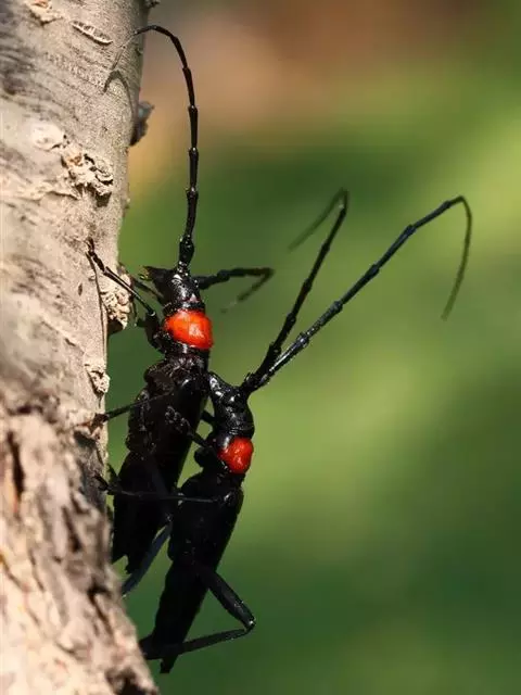 桃红颈天牛是天牛科、颈天牛属昆虫。体黑色发亮,前胸背面大部分为光亮的棕红色或完全黑色。头黑色,…