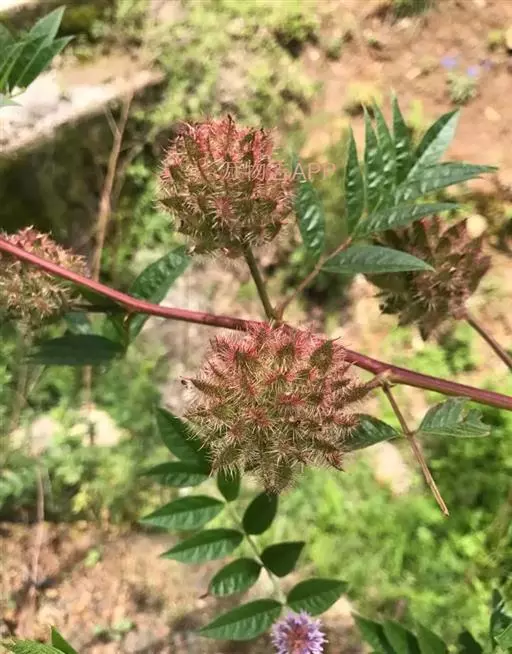 多年生草本;根与根状茎无甜味。茎直立,带木质,多分枝,高60-100厘米,密被鳞片状腺点,疏生短柔毛。叶长8-16厘米;托叶披针形,长5-7毫米,宽2-3毫米,具腺点,无毛;叶柄密被鳞片状腺点,腹面密被白色长柔毛;小叶7-15枚,披针形或卵状披针形,长2-5厘米,宽0.7-1.5厘米,顶端渐尖,基部楔形,上面深绿色,下面淡绿色,两面均密被鳞片状腺点并疏生短柔毛。总状花序腋生,花多数,密集成球状;总花梗短于叶,具条棱,密被鳞片状腺点;幼时疏被长柔毛;苞片披针形,长6-7毫米,密生腺点,花萼钟状,长约5毫米,疏被鳞片状腺点及短柔毛,萼齿5枚,披针形,长为萼筒的1/2-2/3,上部的2齿部分连合;花冠紫色,旗瓣长卵形或椭圆形,长6-9毫米,顶端钝,瓣柄极短,翼瓣长5-6毫米,龙骨瓣稍短于翼瓣,均具瓣柄及耳。果序球状,长2-4厘米,荚果密集,长卵形,长12-18毫米,宽4-6毫米,顶端渐尖,具宿存花柱形成的骤尖头,密被长约5毫米的褐色硬刺。种子褐色,肾形,长约4毫米。花期5-6月,果期7-9月。