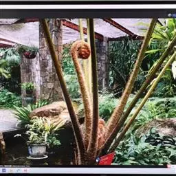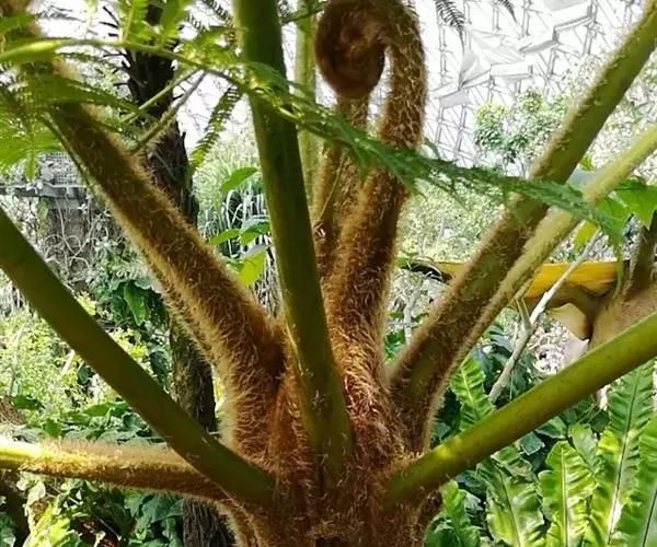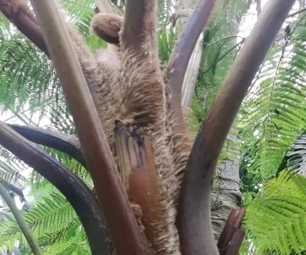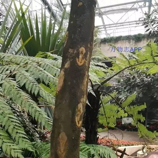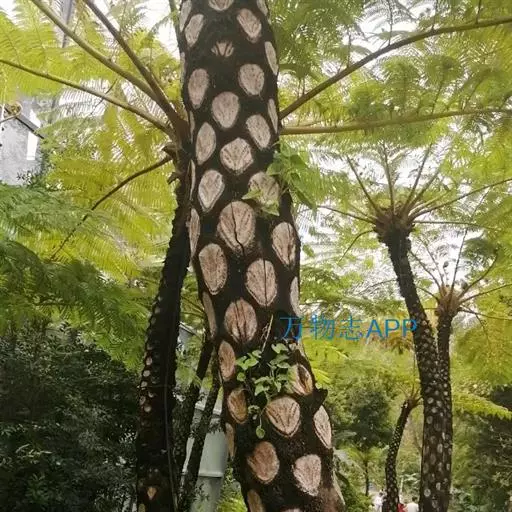 笔筒树的老叶脱落后,会在茎干上留下一个个略呈三角形的椭圆形叶痕,树干截面多为椭圆形,叶柄如蛇形,整个树干看起来就像是蛇一般,所以又有“蛇木”这个称号。