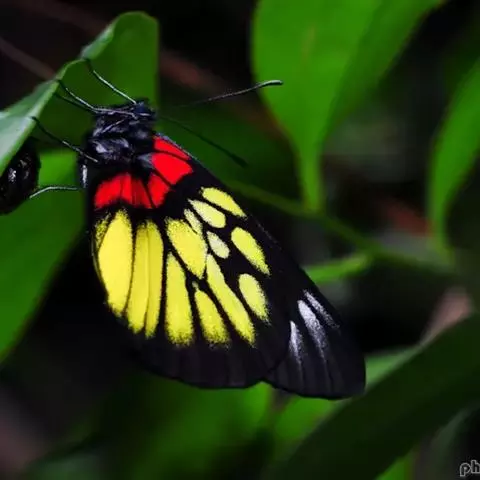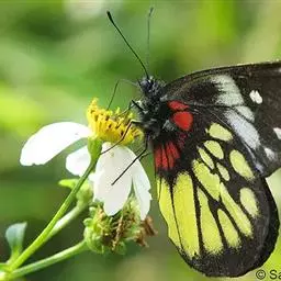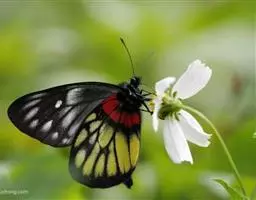 红肩粉蝶,Delias pasithoe curasena,属粉蝶科斑粉蝶属的一个物种。翅膀背面以黑褐色为主,只在翅面上有一些蓝白色小斑或鳞块,雄蝶并于后翅内缘附近有块鲜黄色区;腹面以黑褐色为底色,前翅上有明显的蓝白色斑纹,后翅则有许多鲜黄色斑块,而于翅基有血红色纹彩。