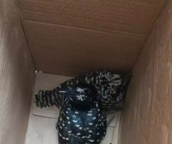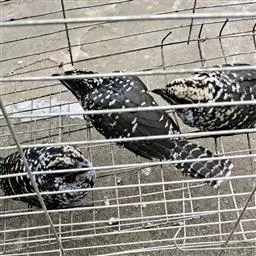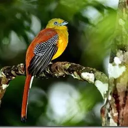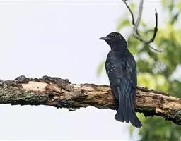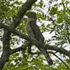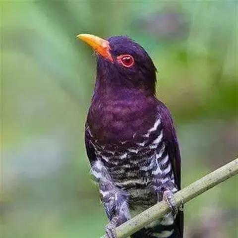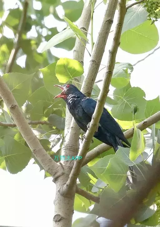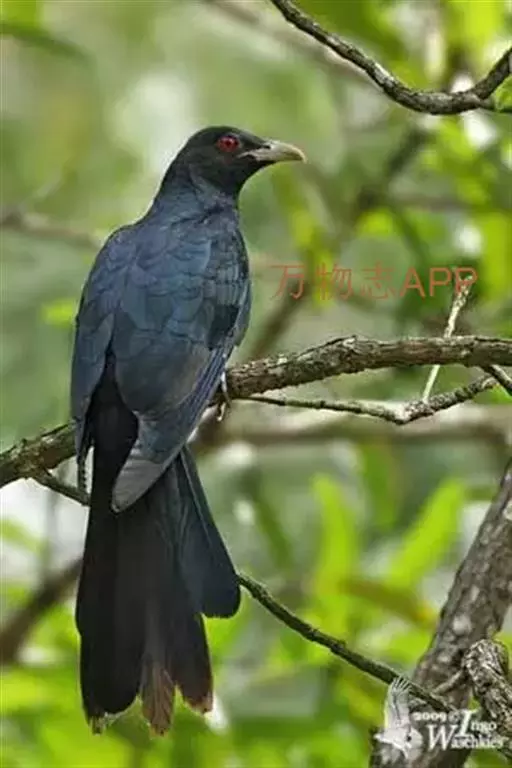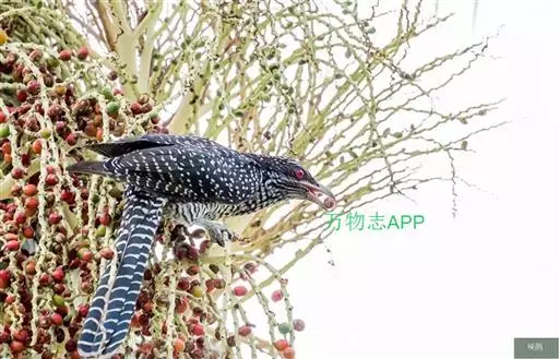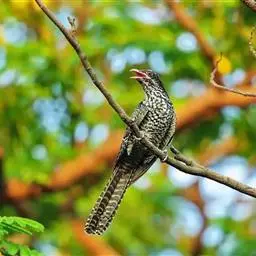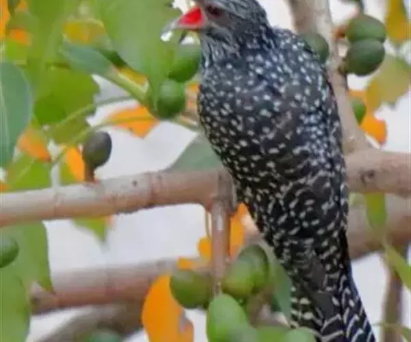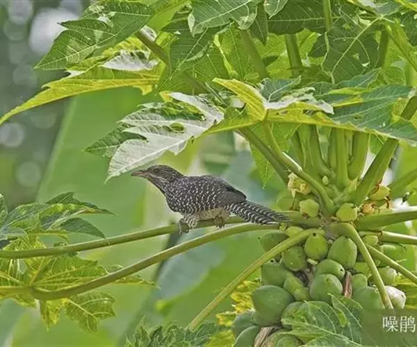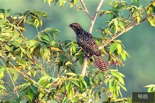 噪鹃(学名:Eudynamys scolopaceus):体长39-46厘米,约重350克。属中型鸟类。雄鸟通体黑色,具蓝色光泽,下体沾绿。雌鸟上体暗褐色,略具金属绿色光泽,并满布整齐的白色小斑点;头部白色斑点略沾皮黄色,且较细密,常呈纵纹状排列。背、翅上覆羽及飞羽,以及尾羽常呈横斑状排列。颏至上胸黑色,密被粗的白色斑点,其余下体白色,具黑色横斑。