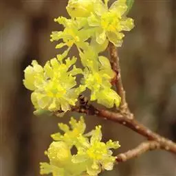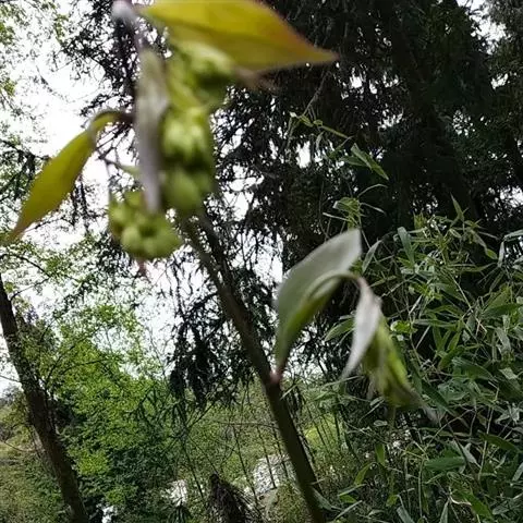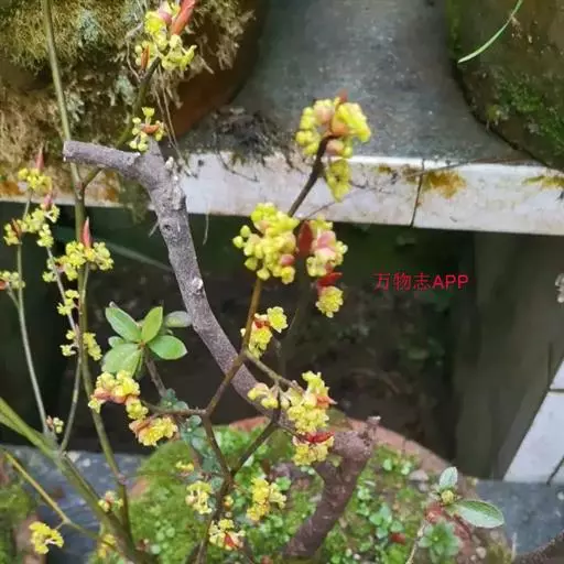 伞形花序着生于叶芽两侧各一,具总梗,长约3毫米,红色,密被红褐色微柔毛,果时脱落;总苞片4,内有花约5朵。雄花花梗长4-5毫米,密被白色柔毛;花被片6,黄色,椭圆形,近等长,长约2毫米,花丝无毛,第三轮的基部着生2个宽肾形具长柄腺体,柄基部与花丝合生;退化雌蕊细小,长约1.5毫米,狭角锥形。雌花花梗长4-5毫米,密被白柔毛;花被片黄色,宽矩圆形,长约2毫米,外轮略小,外面在背脊部被白柔毛,内面被稀疏柔毛;退化雄蕊条形,一、二轮长约1.2毫米,第三轮略短,基部着生2腺体,腺体几与退化雄蕊等大,下部分与退化雄蕊合生,有时仅见腺体而不见退化雄蕊;雌蕊长约2毫米,子房椭圆形,花柱与子房等长,柱头盘状。果球形,直径约7毫米,熟时红色;果梗无皮孔,长约1.5厘米,被疏柔毛。花期4月,果期8月。