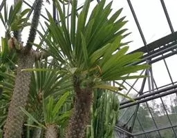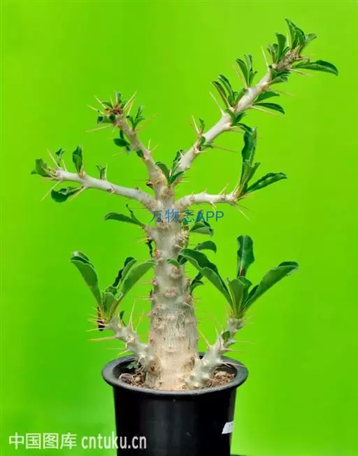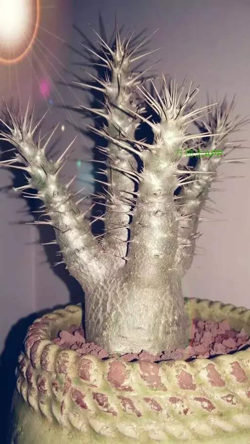 茎干类多肉美花美型种,植株块茎酒瓶状,株高1.5-2M,株幅1M。茎干基部膨大上粗下细,分枝棒状,表皮银白色。散生长刺,3刺一簇灰褐色。绿色叶4-8厘米长,3厘米宽,簇生茎端似伞状。略有短毛。花高脚碟状,白色或淡红色,花瓣中间夹有红条纹。花期夏季。