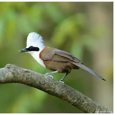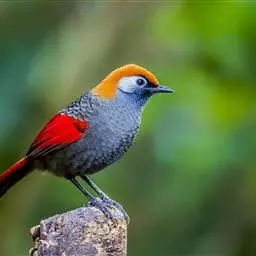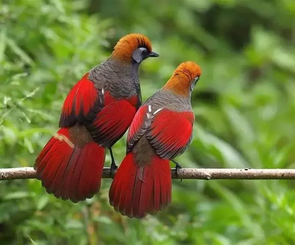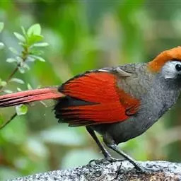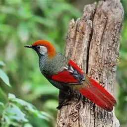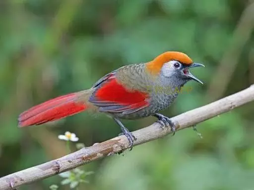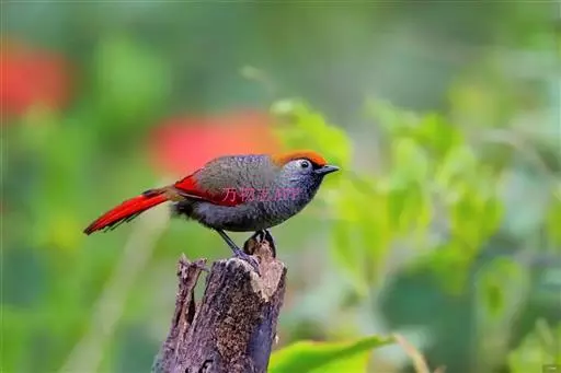 赤尾噪鹛中型鸟类,体长24~28厘米。头顶至后颈红棕色,两翅和尾鲜红色,眼先、眉纹、颊、颏和喉黑色,…
