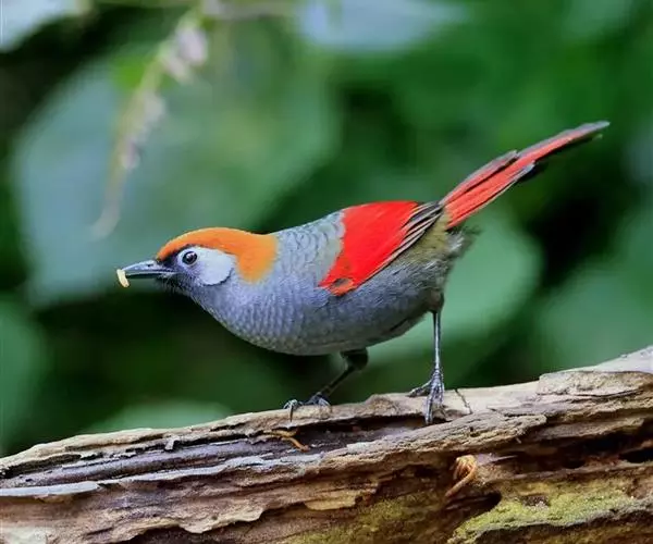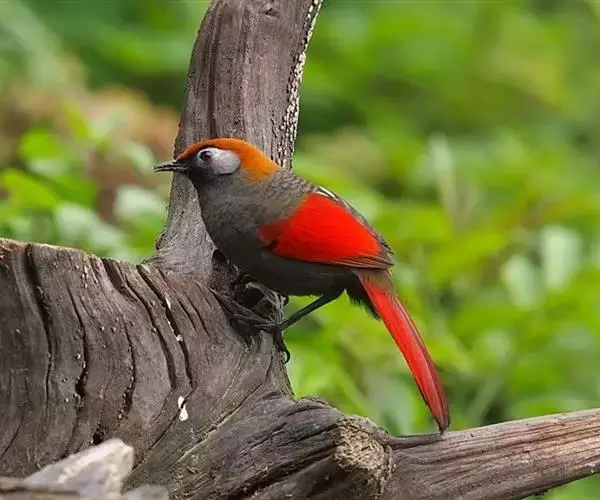 赤尾噪鹛(学名:Garrulax milnei)中型鸟类,体长24~28厘米。头顶至后颈红棕色,两翅和尾鲜红色,眼先、眉纹、颊、颏和喉黑色,眼后有一灰色块斑。其余上下体羽大都暗灰或橄榄灰色。特征极明显,特别是通过鲜红色的头顶、翅和尾。