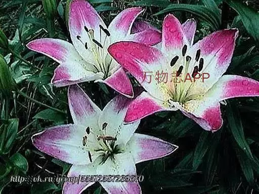 防治病 亚洲百合 虫害百合的病害主要有疫病、灰霉病、病毒病;百合虫害主要有蚜虫、斑潜蝇、地下各种害虫。疫病主要危害根茎部,同时也危害茎叶、花、种球,受害处出现水浸状斑,后变成褐色并皱缩,植株枯萎,茎从受害处折断而死亡,发病初期可喷40%乙磷铝300倍液、25%瑞毒霉500倍液。灰霉病是栽培中的常见病害,危害叶片、花蕾、茎和花,发病初期可用50%福美双可湿性粉剂600倍液喷雾,70%甲基托布津可湿性粉剂800倍液喷雾。病毒病危害主要表现为株矮、畸型、叶退绿斑点产生或白绿相间条带和坏死,叶扭曲、株丛生、花色变异,发病初期可用病毒宁可湿性粉剂500倍液喷雾,还可用金尔康200倍液、20%宁南霉素200~260倍液喷雾防治,同时彻底消灭蚜虫。地下害虫可采用毒谷、毒土防治。斑潜蝇可用70%潜克每667平方米10克,对水50千克喷雾防治,蚜虫可用10%比丹1500倍液喷雾防治