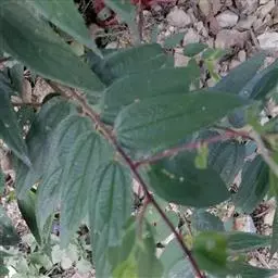 灌木或小乔木;小枝纤细,紫红色,干后变灰褐色或深灰色,密被细粗毛。叶卵状披针形,长3-5(-7)厘米,宽0.8-1.4(-2)厘米,先端渐尖或尾状渐尖,基部圆,稀浅心形,边缘有细锯齿,叶面深绿,干后变深灰绿色,极粗糙(因硬毛脱落后,残留的基部膨大且砂质化,而形成硬的乳凸状凸起所致),叶背浅绿色,干后变灰白色,密被灰短毡毛,在脉上有细粗毛和锈色腺毛,基出脉三条,侧生的二条长达叶片中部,侧脉2-4对;叶柄长2-5毫米,密被细粗毛。