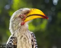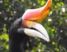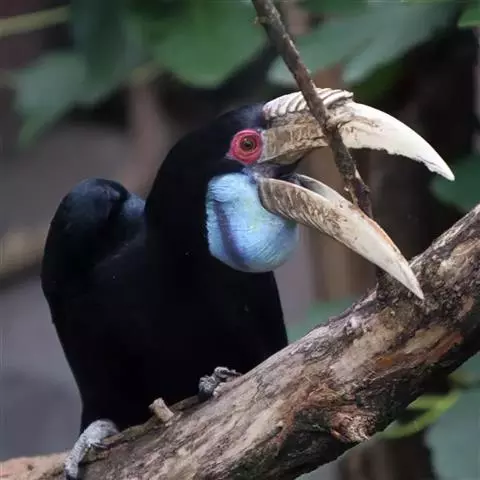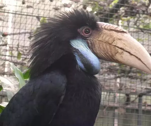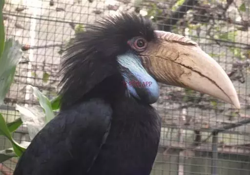 花冠皱盔犀鸟(学名:Rhyticeros undulatus)雄鸟体长约105厘米,雌鸟较小。尾白,雄雌两性的背、两翼及腹部均为黑色,但雄鸟头部奶白色,枕部具略红的丝状羽,裸出的喉囊上具明显的黑色条纹。雌鸟头颈黑,喉囊蓝色。