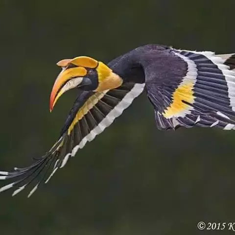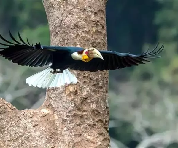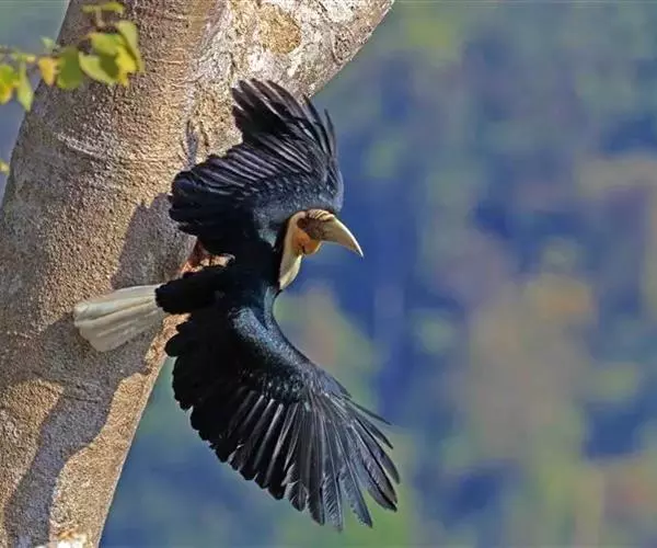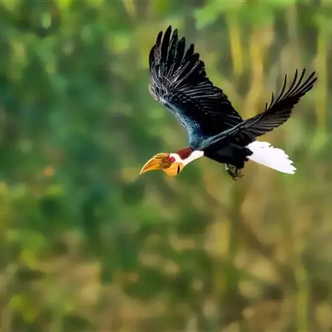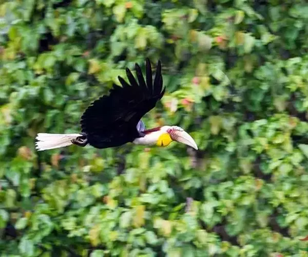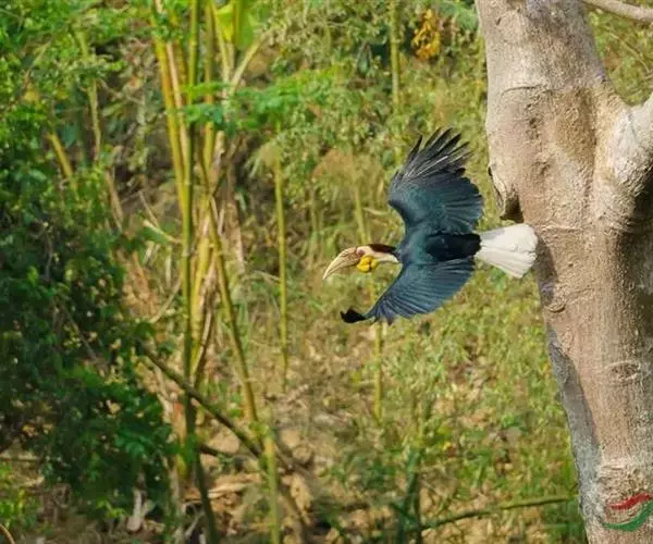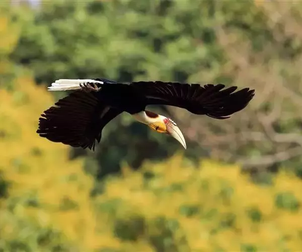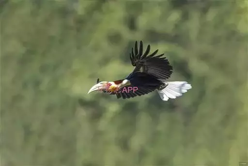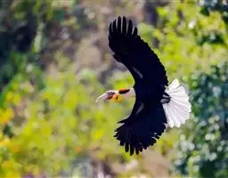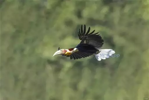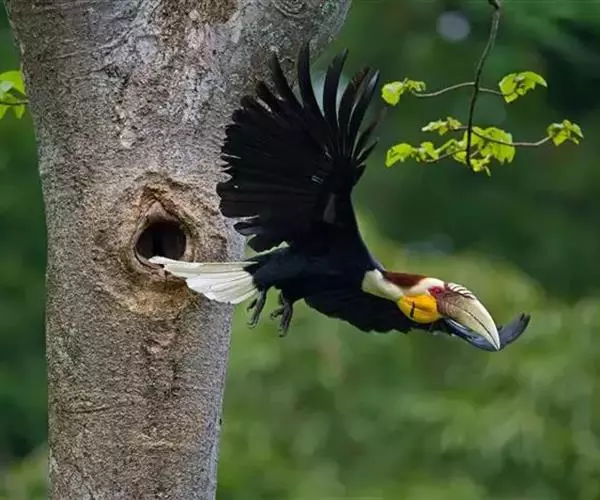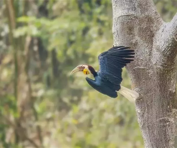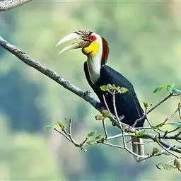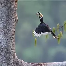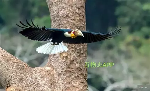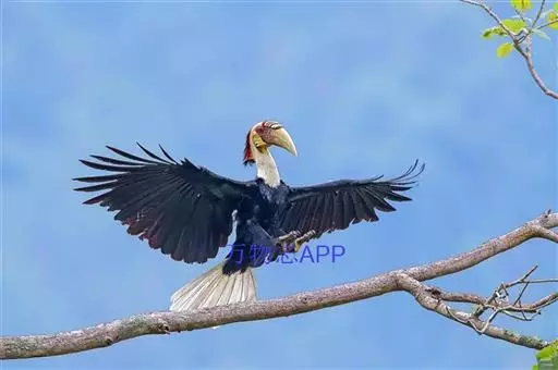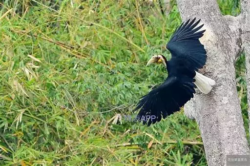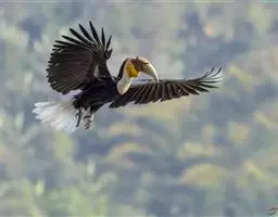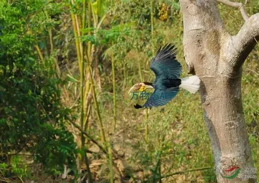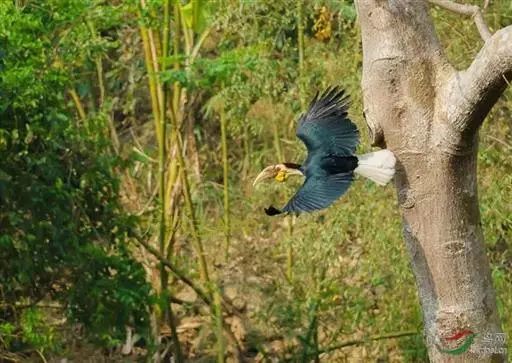 花冠皱盔犀鸟 主要栖息于海拔400~1500m的亚热带常绿阔叶林中,尤其在河流沿岸湿性常绿阔叶林中较易见。