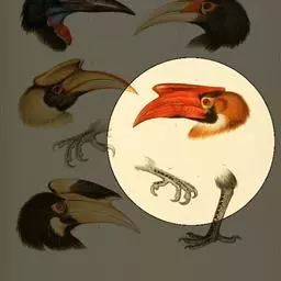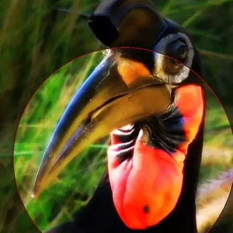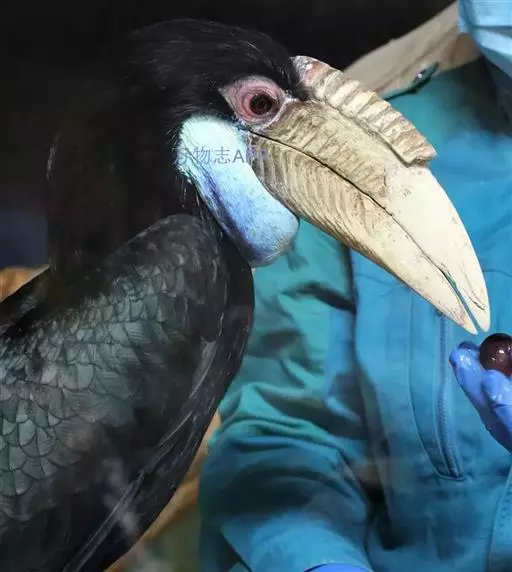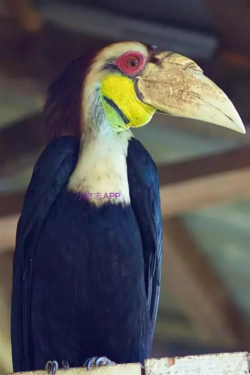 虹膜雄鸟橙红色至血红色,眼周裸露皮肤暗红至砖红色。雌鸟虹膜褐色或灰褐色。嘴象牙黄色,基部缀暗橙红色,雌鸟嘴亦为黄色。嘴缘有细锯齿状缺刻,上嘴基部有一较扁平的盔突,其上有6道皱褶隆起,形成“皱盔”。嘴基两侧各具数道斜形雕纹,脚绿色或石板黑色。