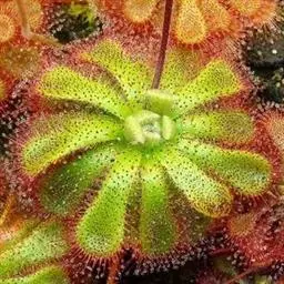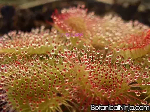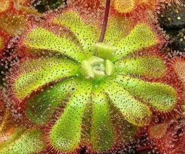 锦地罗 锦地罗的叶呈莲座状平铺地面,宽匙状 的叶,边缘长满腺毛,待昆虫落入,腺毛将虫体包围,带粘性的腺体将昆虫粘住,分泌的液体可分解虫体蛋白质等营养物质,然后由叶面吸收。