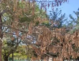 病害 为黑松枝枯病。又名黑松枯梢病、垂枝病和软枝病,病原经鉴定为铁锈薄盘菌(Cenangium feruginosum Frex Fr),属子囊菌亚门,盘菌纲,柔膜菌目,薄盘菌属。该病菌是一种弱寄生菌,普遍潜伏在树体内,在树木正常生长的情况下,并不造成危害,一旦遭遇旱、涝、冻等气象灾害,导致树势衰弱时,枝枯病菌才能危害树体。因此,黑松枝叶发黄和枯死的直接原因是枝枯病,而气候异常是引起枝枯病大发生的主要诱因。在我国分布于东北、山东、河北、陕西、北京等地区,松树从苗木、幼树到成年树均可受害,轻者枝条枯死,重者全株死亡。至90年代初期,青岛市前海一线黑松枝枯病发病率高达98%,部分病树成片死亡。症状表现有多种形式,如顶芽枯死、枯叶、枯梢、根腐、软枝、生长不良等,发病严重时,即使是数10年生的大树全株亦无一健康的新梢。当小枝、侧枝或干部发病时,其上的针叶先变为黄绿,逐渐红褐色,当针叶变为红褐色时,被害枝干则明显表现出因失水而病皮收缩起皱的病状,针叶逐渐脱落、叶痕处稍膨大。病害若发生在小枝上,小枝则干枯死亡。主干皮部发病时,开始有轻微的流脂现象,随后流脂加剧,病皮亦逐渐干缩下陷。