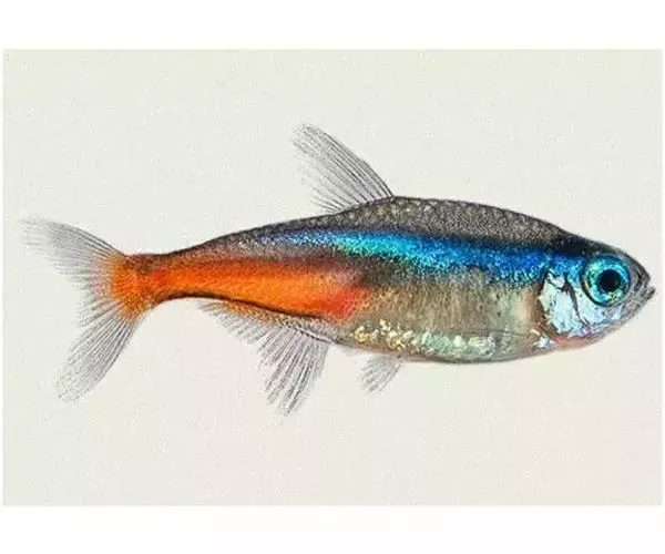 霓虹脂鲤的体色鲜艳华丽,背部橄榄绿。眼睛黑色,眼眶银蓝色镶有黑边,发出青绿色光 彩。在侧线上方从眼睛起延伸到尾柄,有一条浅蓝色霓虹彩的纵带,鲜艳夺目。纵带上方直至背部由棕色转为黑色,纵带下方臀鳍前为银白色。体后中央延至尾柄有一条鲜红色条纹。身上那条明亮的彩带在不同角度 的光线折射下,有时会显示绿色,有时则会显示蓝色,与身体上下部那条鲜红条纹配起来,红绿闪烁,加上臀鳍银白,颜色配合恰到好处,尤其是在灯光照耀的夜间水草造景水族箱中,几十尾霓虹脂鲤,成群结队, 顿使水草造景水族箱倍增光彩,如观焰火,魅力无穷,十分惹人喜爱。