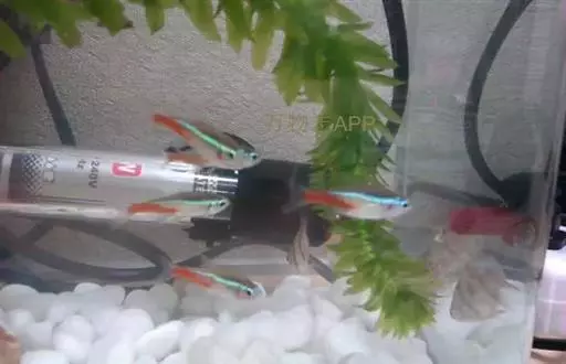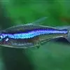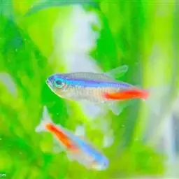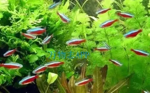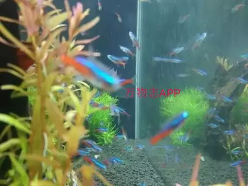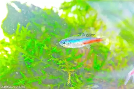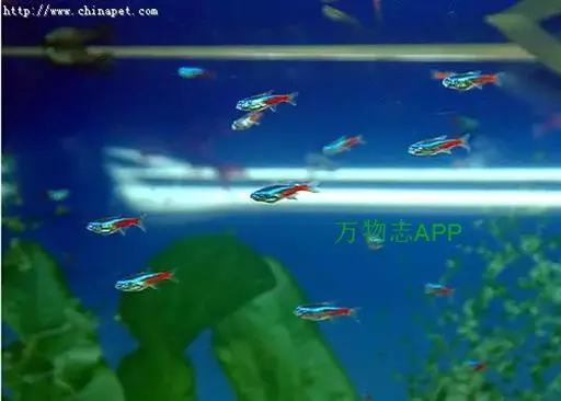 霓虹灯鱼又被称为红绿灯鱼、红莲灯鱼。鱼纲,脂鲤科(拟鲤科)。原产亚马孙河上游。体长3~4厘米,体形较细,色泽美丽,体上部的绿线,因光线角度不同,有时显出蓝色,与体下部的红线极为协调(后腹部至尾鳍基部为红色),又与腹部全红的新红绿灯鱼〔新红莲灯鱼;(Paracheirodon simulans)〕有明显差异。鱼性胆小,常在水上安静的环境下游动。喜食活水蚤,极易饲养。