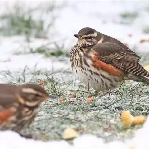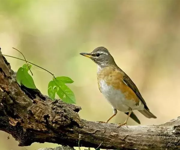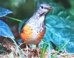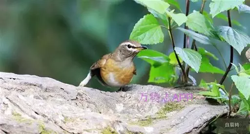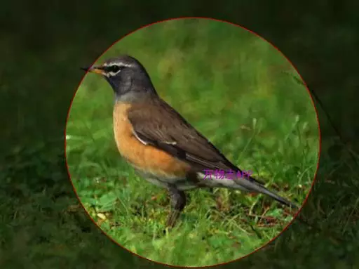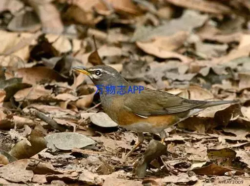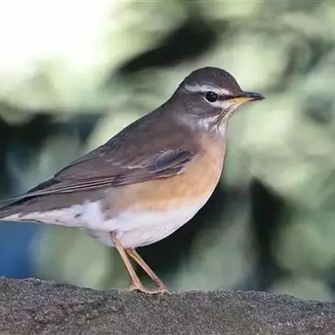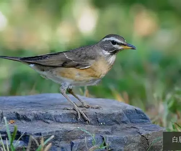 白眉鸫(学名:Eyebrowed Thrush):中型鸟类,体长19-23厘米。雄鸟头、颈灰褐色,具长而显著的白色眉纹,眼下有一白斑,上体橄榄褐色,胸和两胁橙黄色,腹和尾下覆羽白色。雌鸟头和上体橄榄褐色,喉白色而具褐色条纹。其余和雄鸟相似,但羽色稍暗。