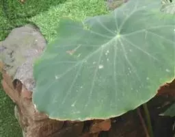 叶多数,叶柄绿色或污紫色,螺状排列,粗厚,长可达1.5米,基部连鞘宽5-10厘米,展开;叶片亚革质,草绿色,箭状卵形,边缘波状,长50-90厘米,宽40-90厘米,有的长宽都在一米以上,后裂片联合1/5-1/10,幼株叶片联合较多;前裂片三角状卵形,先端锐尖,长胜于宽,I级侧脉9-12对,下部的粗如手指,向上渐狭;后裂片多少圆形,弯缺锐尖,有时几达叶柄,后基脉互交成直角或不及90度的锐角。
