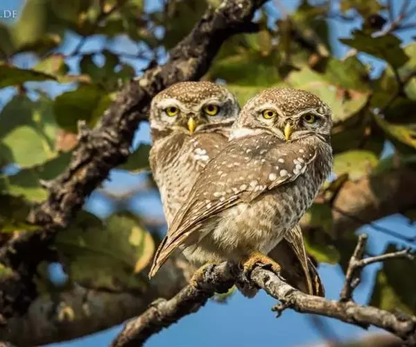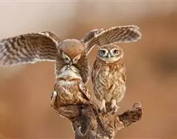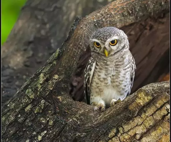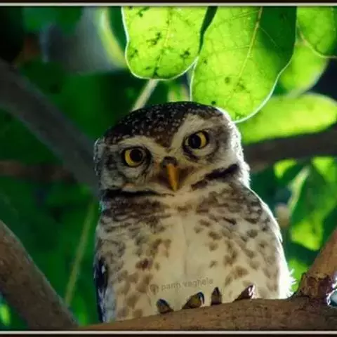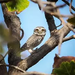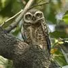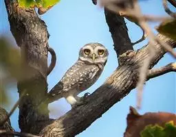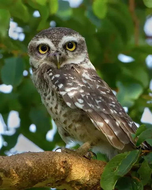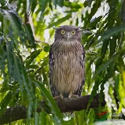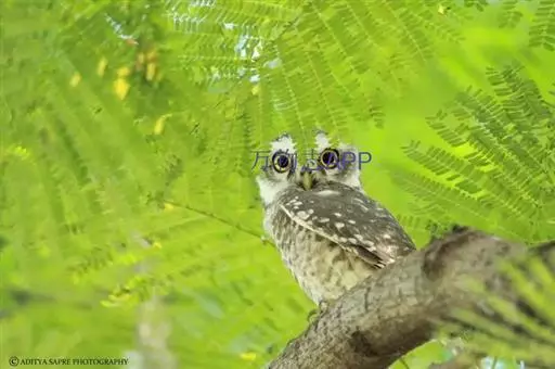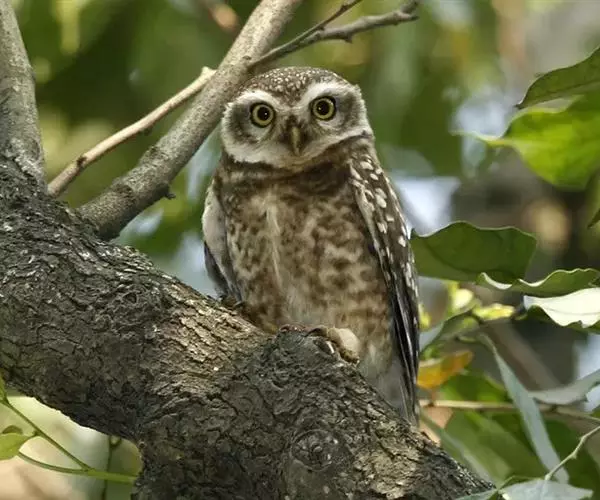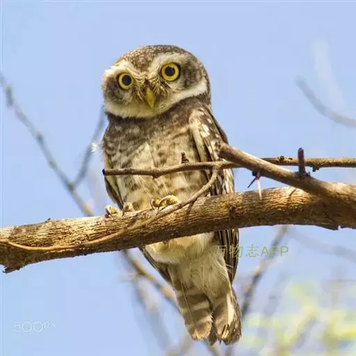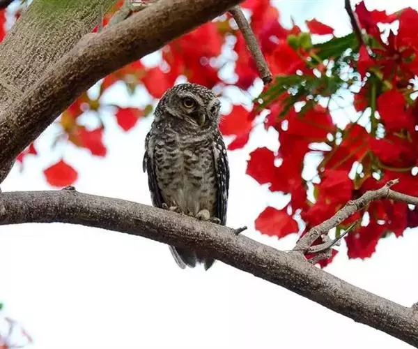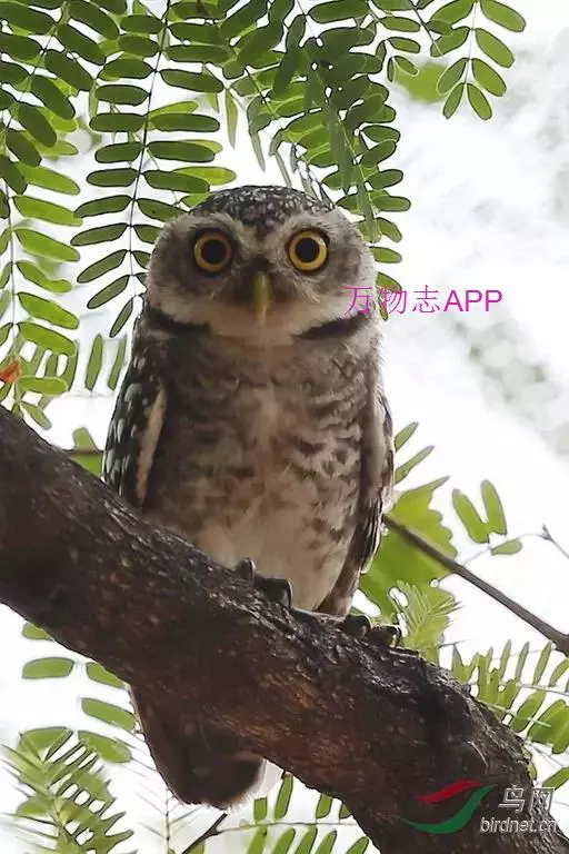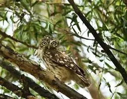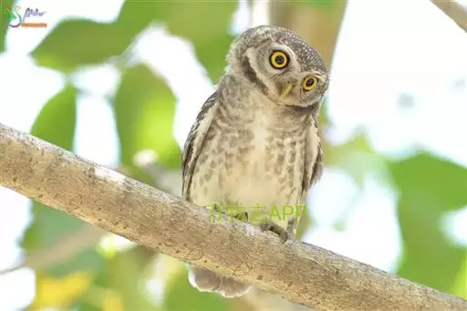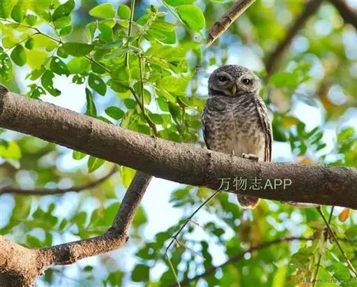 横斑腹小鸮(Athene brama):是鸱鸮科、小鸮属的一种鸟类。体长20厘米左右。面盘不明显,没有耳羽簇,皱领也不显著。跗蹠和趾被羽。上体为灰褐色至棕褐色,具白色斑点,尤以头顶较为细密,眉纹和两眼之间为白色,后颈具不完整的白色翎领。下体为灰色,没有条纹,两胁具横斑,所以得名,但腹的中部为纯白色,没有斑。虹膜金黄色。嘴角绿色,嘴峰有时较暗,有时较黄,蜡膜绿色或绿褐色,脚黄绿色,铅绿色或暗黄色。
