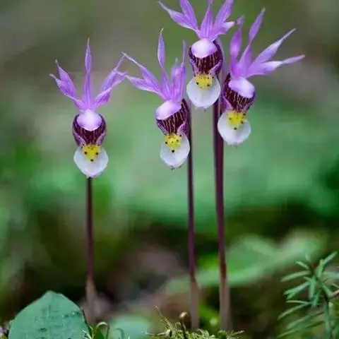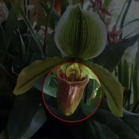 花瓣线形,黄绿色,长9-10毫米,宽1毫米,先端渐尖,具1脉;唇瓣位于上方,长椭圆状披针形、长椭圆状卵形或披针状卵形,大,长15-21毫米,宽5-7毫米,不裂,背面黄绿色,内面桔红色而具鲜红色斑点,近先端处略黄色,先端渐尖,基部圆形且呈浅囊状,内面有细毛;蕊柱粗短,长2毫米,粗2.8毫米;花粉团4个,成2对,黄色,粒粉质,长1.5-1.7毫米。花期5-6月。