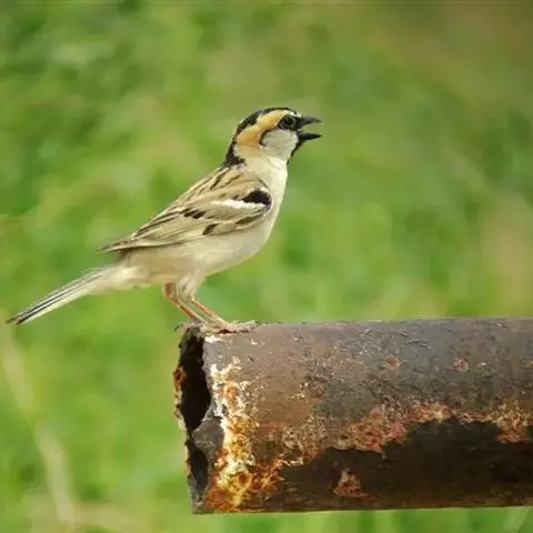 山麻雀:小型鸟类,体长13-15厘米。雄鸟上体栗红色,背中央具黑色纵纹,头棕色或淡灰白色,颏、喉黑色,…