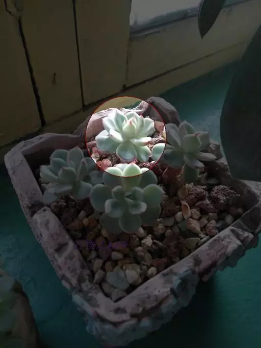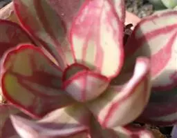 植株小型,无茎的莲座叶盘非常紧凑。卵形叶较厚,带小尖,长4厘米、宽2厘米。