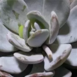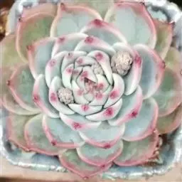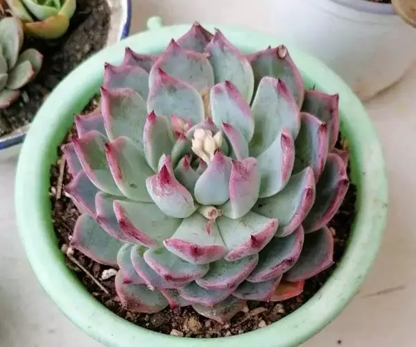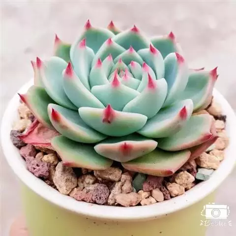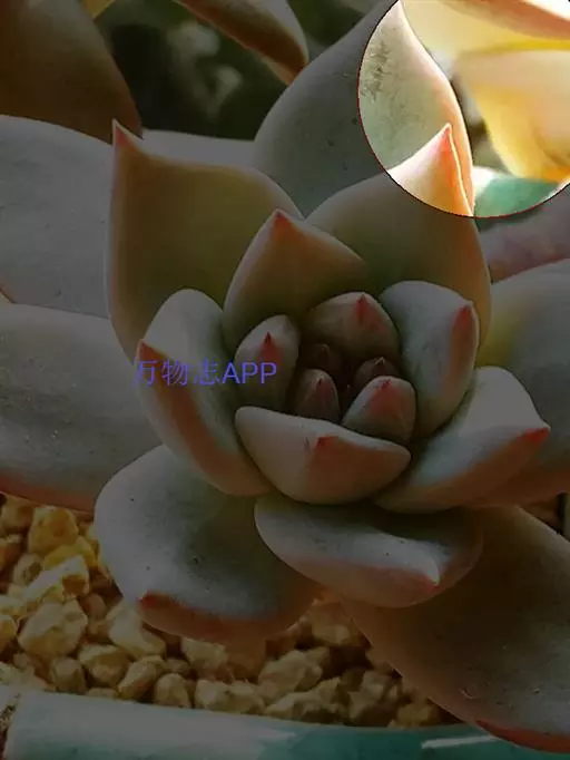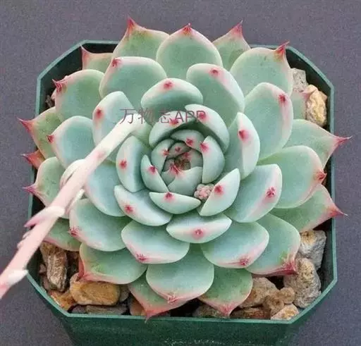 蓝绿至灰绿、淡绿色,并被有浓厚的白粉,日照充足时顶端的小尖呈美丽的玫瑰红或深粉红色。