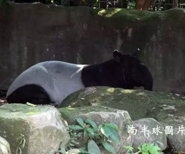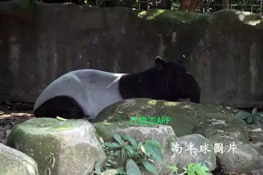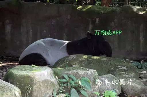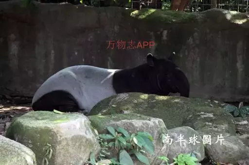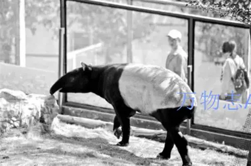 亚洲貘(学名:Tapirus indicus):亦称马来貘,是貘类中最大的一种,体长为1.8-2.5米,肩高90-120厘米,尾长5-10厘米,体重250-540千克。又叫五不像,它的鼻似象,耳似犀,尾似牛,足似虎,躯似熊,全身毛色黑白相间。长相十分奇特而有趣,一副呆头呆脑的样子,身体滚圆而肥壮,皮肤很厚,头部比猪大得多,脖子粗壮,鼻吻部延长、突出呈圆筒形,柔软而下垂,雌性比雄性大一点