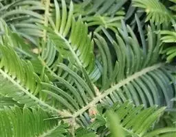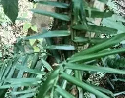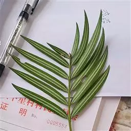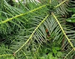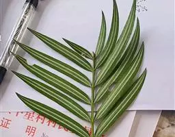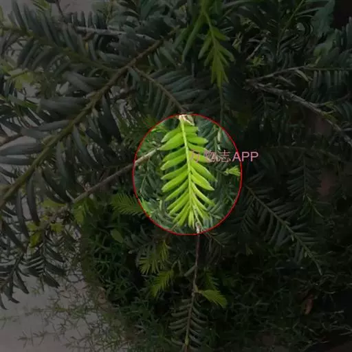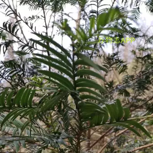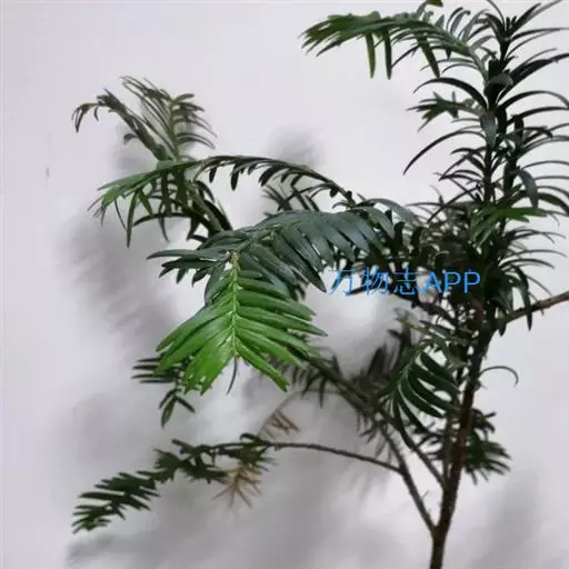 叶排列成两列,条形,微弯或较直,长1-3(多为1.5-2.2)厘米,宽2-4(多为3)毫米,上部微渐窄,先端常微急尖,稀急尖或渐尖,上面深绿色,有光泽,下面淡黄绿色,有两条气孔带,中脉带上有密生均匀而微小的圆形角质乳头状突起点,常与气孔带同色,稀色较浅。