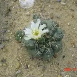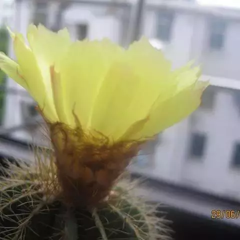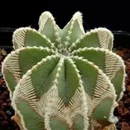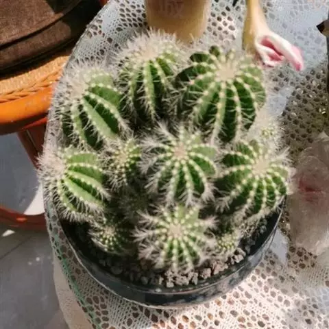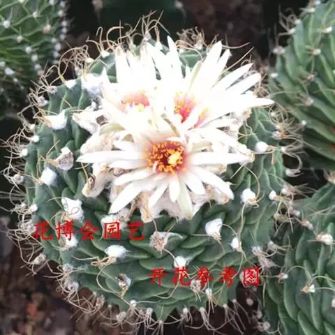 江守玉为仙人掌科强刺球属,植株扁圆形至球形,后成圆柱状,体色灰绿,刺座上附生白色绒毛,花橙黄色,漏…