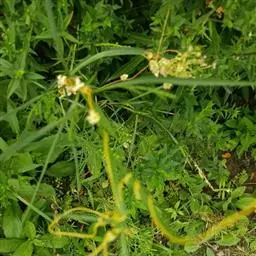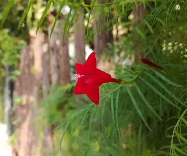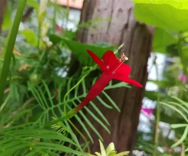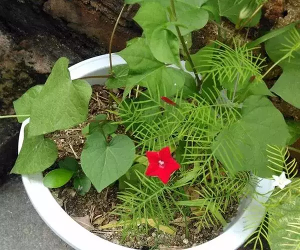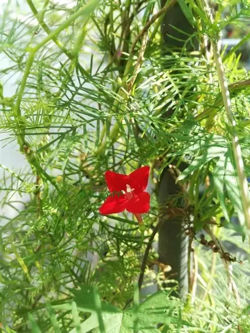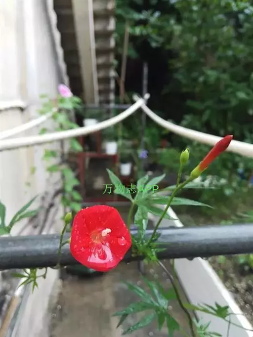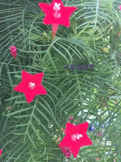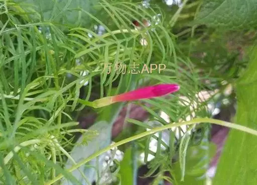 1年生草质藤本植物。茎细长柔软光滑。叶羽状细裂,茂密细腻。小花高脚碟形,花色鲜红、深红或白色,点点铺撒在绿色叶丛中,清丽诱人,花期7—10月。果成熟黑色,易脱落,应及时采收。