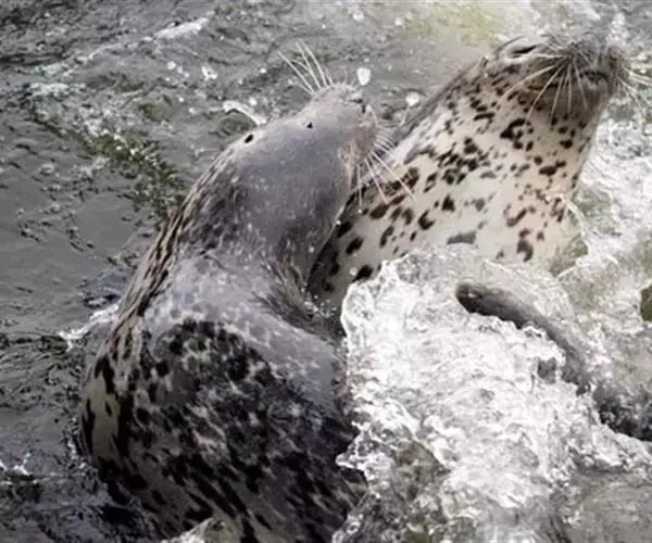 人工饲养条件下,斑海豹的性成熟年龄一般在5岁左右。交配追逐时,常发生打架受伤现象。交配时,雄兽用前肢的爪紧紧扣住雌兽身体两侧,伏在雌兽背上,用嘴咬住雌兽颈部肌肉,浮在水中静止进行交配。雄兽交配次数与交配时间均随年龄的增长而递减。