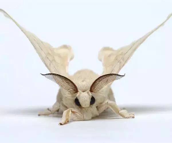蚕蛾的成虫全身被白色鳞片和毛。头部小,复眼一对, 蚕蛾 触角羽毛状,口器退化,不能吃食物。胸部三对足,两对翅,由于人工长期饲养,飞行能力退化。雄蛾身体较雌蛾小,触角具有较长的羽状小支。