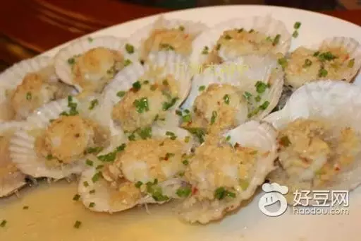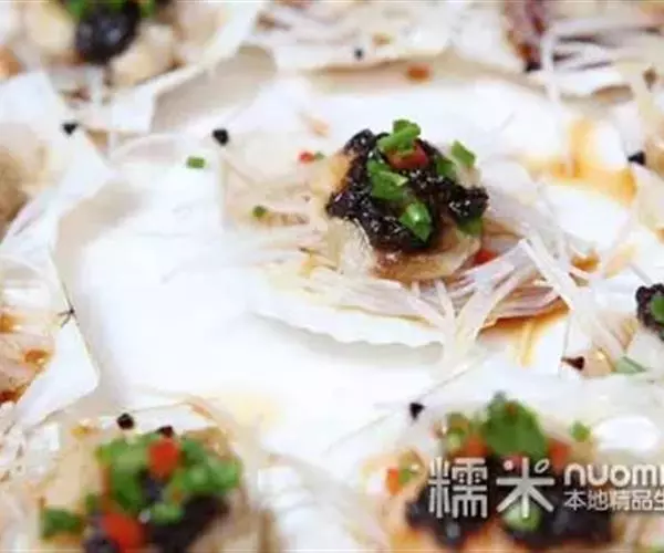 豉汁扇贝,山东威海著名的特色小吃,做法简单,咸鲜味十足。扇贝放在装有清水的盆里泡上一个小时;然后用刷子刷干净外壳;把扇贝用小刀撬开,把内脏及腮去除;把用温水泡软的粉丝放到扇贝上;大蒜成蒜蓉;在炒锅里放油把蒜蓉炒出香味盛出;趁热把蒜蓉油分别放在每个扇贝的粉丝上面;在扇贝上均匀的浇上蒸鱼豉油;蒸锅水开后放入扇贝,蒸八分钟即可;出锅后放上些香葱碎做点缀。