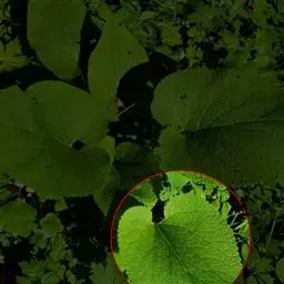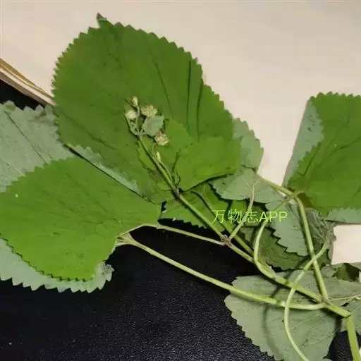 叶近圆形、圆卵形至卵状长圆形,长5.2-12厘米,宽2.5-12厘米,先端急尖,稀渐尖,基部浅心形或圆形,边缘为具胼胝尖的锯齿状牙齿,或为不整齐的圆齿,上面橄榄绿色,疏被疏柔毛及星状疏柔毛,下面较淡,毛被同叶上面,但有时较密,叶柄长1-12厘米,腹凹背凸,密被短硬毛;苞叶通常为卵形,长1-3.5厘米,宽0.6-2厘米,边缘为粗锯齿状牙齿,毛被同茎叶,叶柄长2-3毫米。