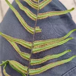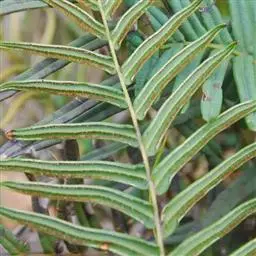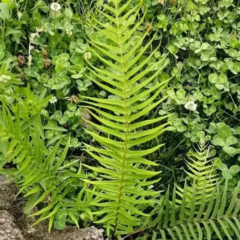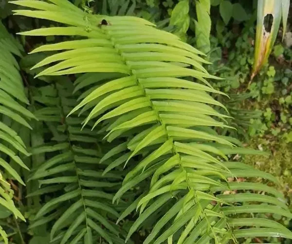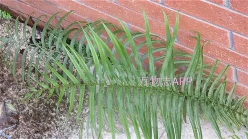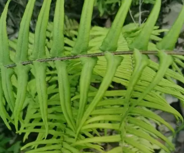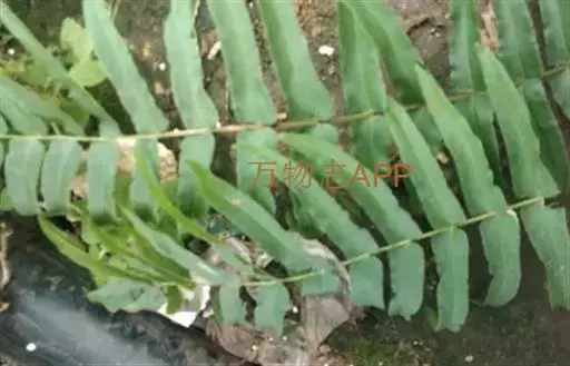 叶簇生;柄坚硬,长10-30厘米或更长,基部粗3-4毫米,深禾秆色至浅褐色,幼时密被与根状茎上同样的鳞片,以后渐变稀疏;叶片倒披针状长圆形,长20-90厘米或更长,宽5-25厘米或更宽,一回羽状;顶生羽片与侧生羽片同形,侧生羽多数(可达40对),互生或有时近对生,下部羽片较疏离,相距3-4厘米,斜展,无柄,不与叶轴合生,向下羽片逐渐缩短,基部羽片仅为耳形,中部羽片最长,狭线形,长6-15厘米宽5-10毫米,先端渐尖,基部扩大并为浅心脏形,其两侧稍呈耳形,上侧耳片较大并常覆盖叶轴,各羽片间的间隔宽约1-1.5厘米,不育的叶缘有微细而均匀的密锯齿,不为软骨质。主脉下面隆起并为浅禾秆色,侧脉纤细,密接,斜展,单一或分叉。叶干后薄革质,暗绿色,无光泽,无毛;叶轴禾秆色,疏被鳞片。在成熟的植株上除下部缩短的羽片不育外,几乎全部羽片均能育。