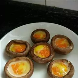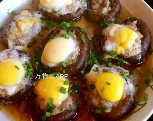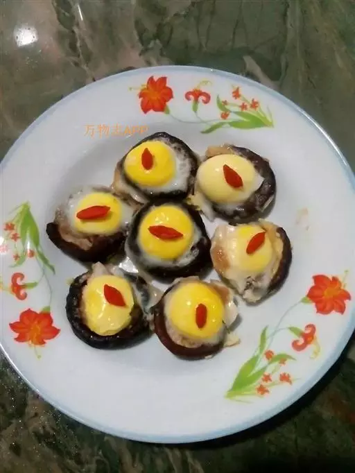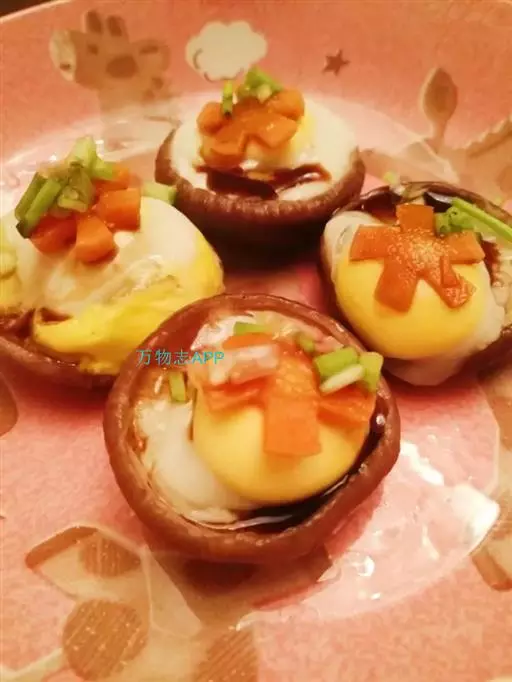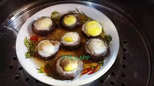 2、然后将鹌鹑蛋打到香菇盖中,装盘待用;将装盘的香菇鹌鹑蛋放入蒸锅中,大火烧开,然后转小火蒸10分钟;